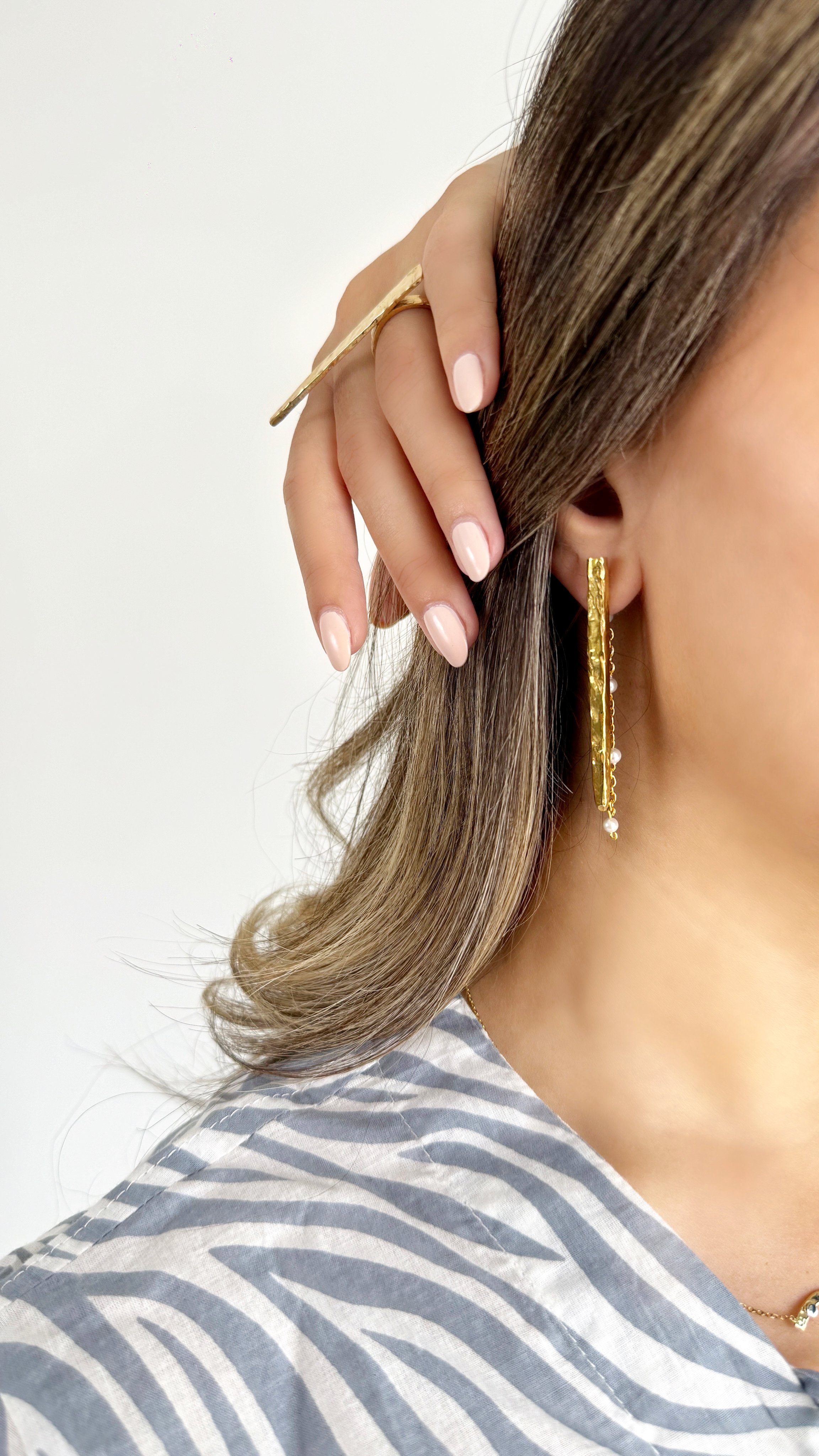 Working with 18k gold and gold-plated finishes, her designs are drawn from architecture, nature, and everyday beauty, where lines, textures, pearls, and gemstones transform into stories in wearable form.