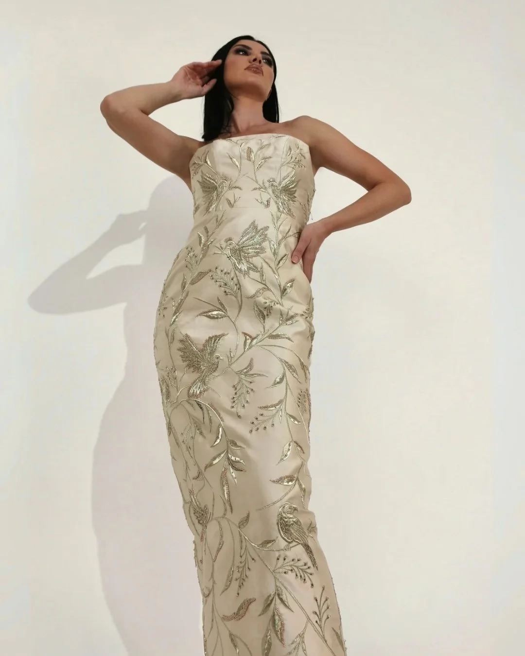 Maria Weld Ali’s standout pieces are the FAKHR “فخر” dresses, celebrated for their graceful silhouettes and artisanal detail, and the coloured Taffeta Thobes from the ARCHIVE Collection, which inject bold, modern vibrancy into timeless tradition.