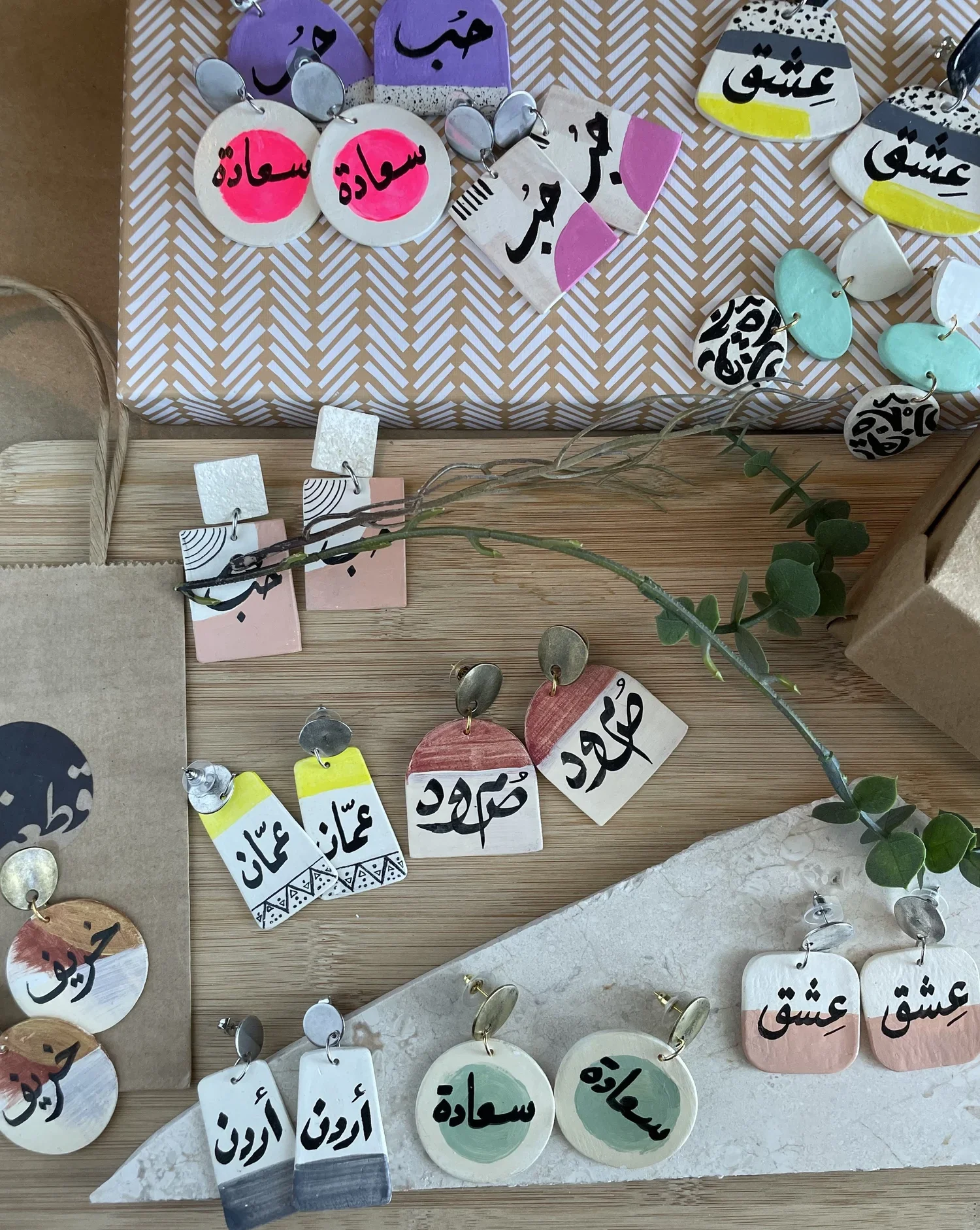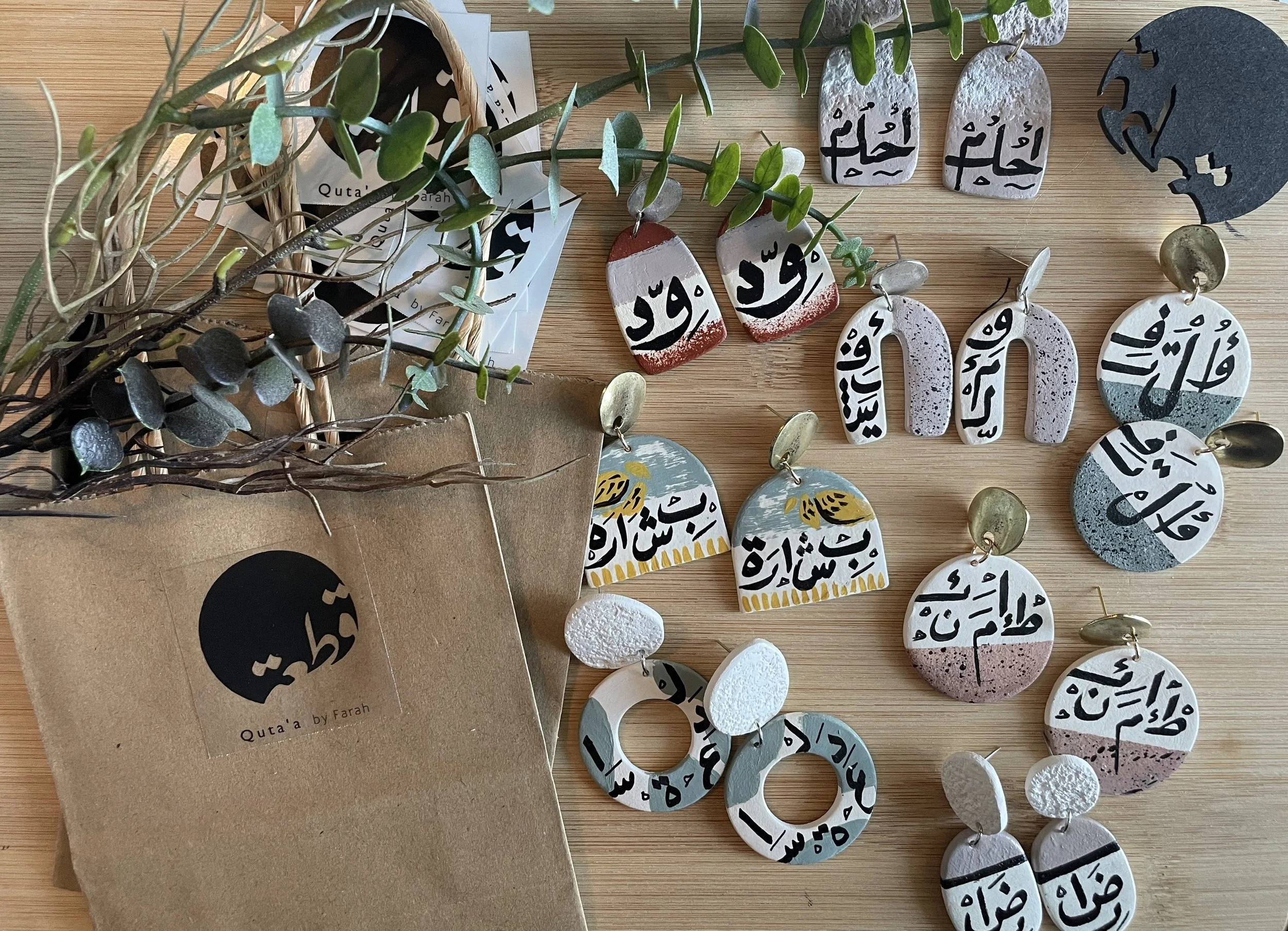 Farah Abdo transforms resilience into wearable art. At Quta’a, each handmade clay earring, necklace, or charm blends painting and Arabic calligraphy to reflect identity, culture, and emotion. Every piece carries a story; crafted with intention, rooted in heritage, and made for those who wear their strength with beauty.