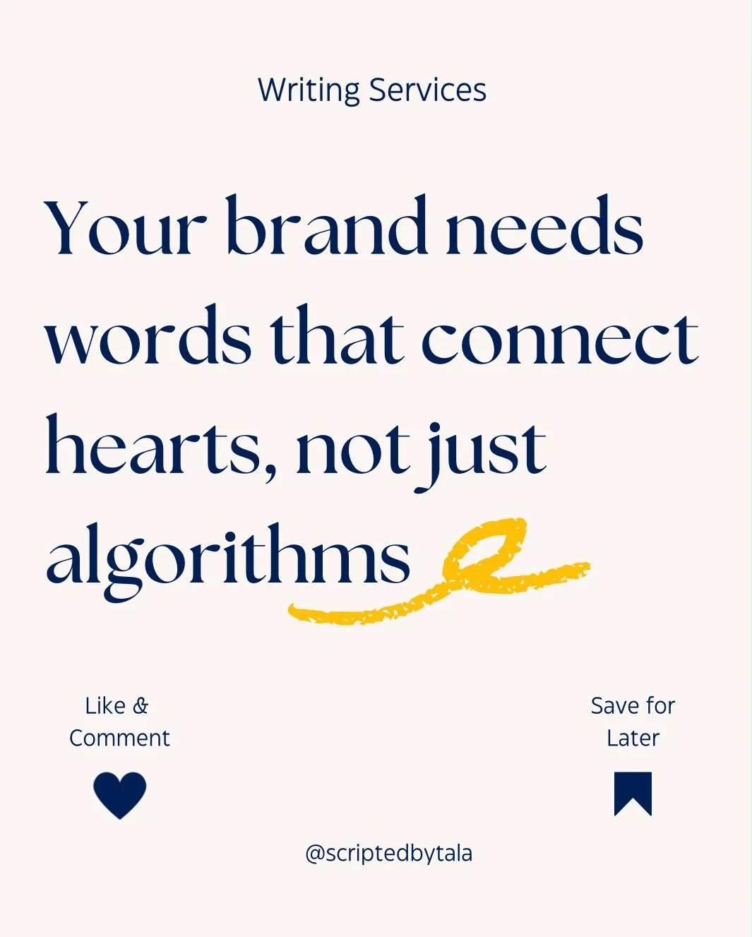From defining your brand voice to shaping your story and writing words with intention, Scripted by Tala brings strategy and character to every line. With intention as the core and storytelling as a craft, Scripted by Tala offers writing services that capture attention, build connection, and leave a lasting impression on every reader.