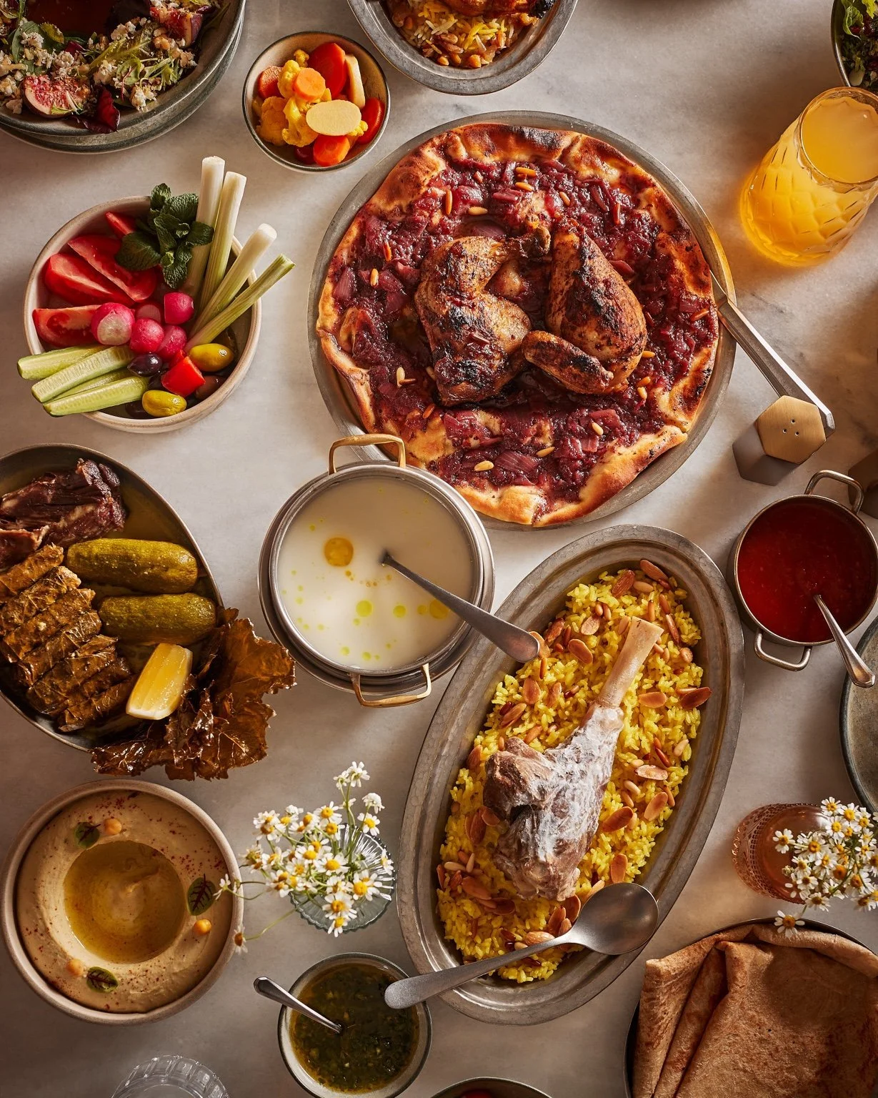 At Matbakhi by Sawsan—matbakhi meaning ‘kitchen’ in Arabic—the spirit of a generous home table defines the Ramadan experience. As evening falls, the menu unfolds with comforting soups such as freekeh and lentil, followed by crisp salads our Arab kitchens love, including tabouleh, fattoush, and baladi. A spread of cold mezze brings hummus, moutabal, and mhammara to the table, while hot bites like kubbeh, sambousa, and golden fries add warmth and familiarity. Classic Levantine favorites continue with fatteh and sfeeha before heartier mains arrive: mussakhan, shishbarak, koussa bil laban, kubbeh bil laban, and rotating dishes such as machboos dejaj or mansaf. Grilled meats round out the feast, inviting guests to linger over flavors that feel both delicious and comforting.